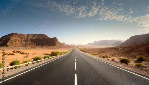 Fototapeta premium Endless Desert Adventure on an Empty Asphalt Road: A Breathtaking Journey Across Arid Landscapes, Capturing Vast Horizons and Expansive Sky Views in Remote Desert Wilderness – Discover