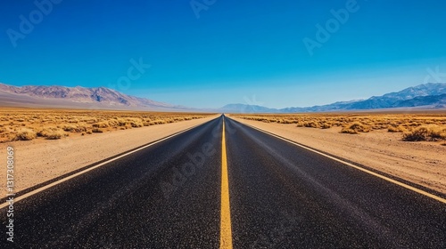 Fototapeta premium Endless Desert Highway: A Journey Through Arid Landscapes Under a Vast Blue Sky