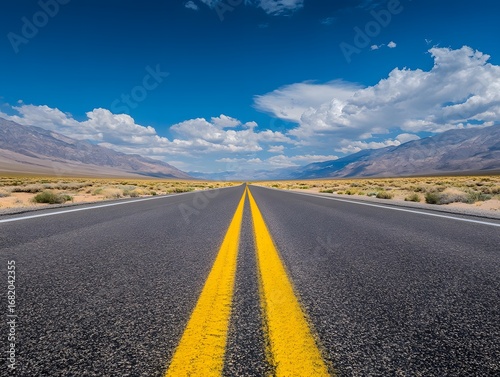 © Rady, Fototapeta premium Endless Desert Road Adventure: Scenic Highway Journey Under Blue Sky and White Clouds