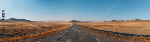 © Sunshine, Naklejka premium Endless Desert Road Leading to Distant Mountains Under Clear Blue Sky in Panoramic View