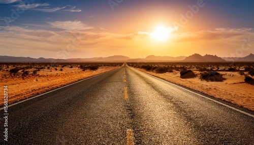 Fototapeta premium endless desert road stretching to the horizon under a vast open sky in golden...