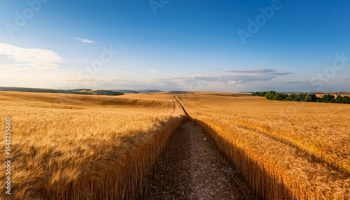 © Blair, Fototapeta premium endless golden fields stretch out under a clear blue sky where a winding path leads through the rippling grains at golden hour inviting exploration and tranquility