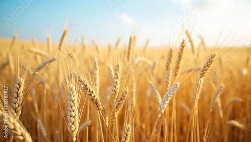 Fototapeta premium Endless golden wheat field ready for harvest under bright blue sky