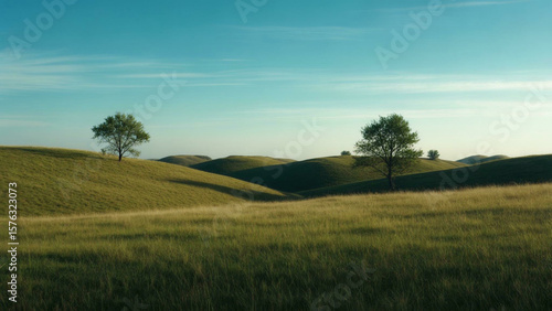 © Rani, Obraz premium Endless Green Grass Landscape under Blue Sky
