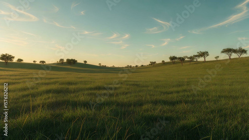 © Rani, Obraz premium Endless Green Grass Landscape under Blue Sky