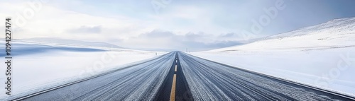Fototapeta premium Endless highway through a snow-covered landscape, evoking the solitude and...