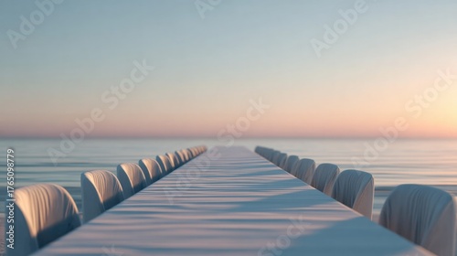 © Irina B, Fototapeta premium Endless holiday table setting at sunset extending into horizon for elegant event design concept