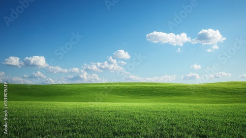 Obraz premium Endless Horizon: A vibrant panorama of a lush, verdant field under a bright, clear blue sky adorned with fluffy white clouds.