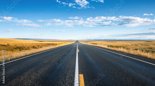 Naklejka premium Endless Horizon: Crisp A straight asphalt road Imagery – Smooth, Jet-Black...