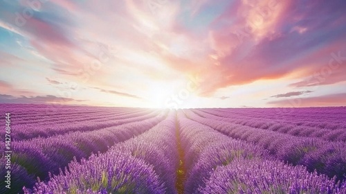 Obraz premium Endless Lavender Field Under Colorful Sky at Sunrise
