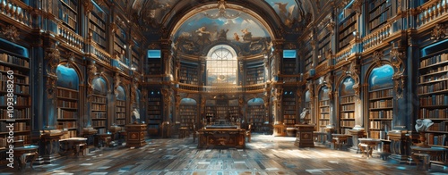 © zhuan, Fototapeta premium Endless Library with Ancient Books and Historical Manuscripts, Illuminated by Blue Light from Above, Featuring a Large Desk and Wooden Shelves