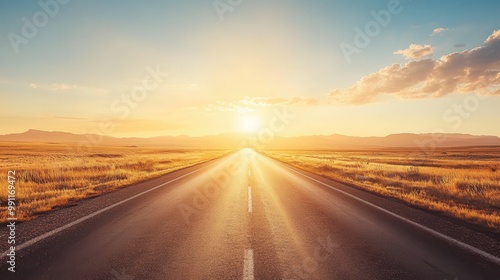 © Sunshine, Fototapeta premium Endless Open Road at Sunset with Golden Fields and Dramatic Sky - Perfect for Travel and Adventure Themes