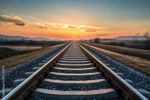 Fototapeta premium Endless railway tracks stretching towards a vibrant sunset, symbolizing...