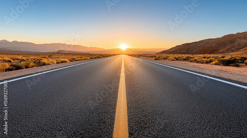 Naklejka premium Endless road stretching into horizon at sunrise, surrounded by desert landscape