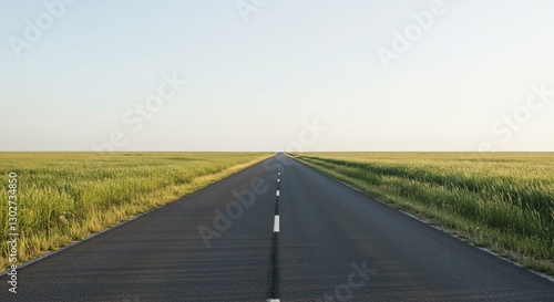 Fototapeta premium Endless road stretching through golden fields under a soft, pale sky