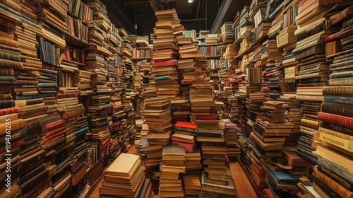 Fototapeta premium Endless rows of stacked books creates a captivating labyrinth in a charming bookstore