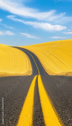 © Wimon, Fototapeta premium Endless rural highway with golden fields on both sides, stretching into the distance beneath a stunning sky, perfect road trip scenery