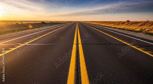 Fototapeta premium Endless Straight Road Disappearing into Horizon at Golden Hour, Symbolizing...