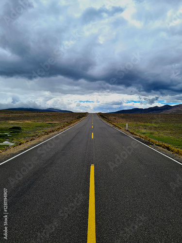 © Nicolas Meder, Naklejka premium Endless straight road through the Andes mountains under a dramatic sky, Peru.
