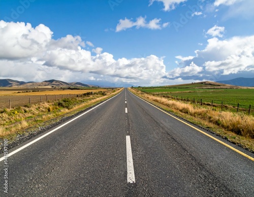 © Tuachan, Fototapeta premium Endless Straight Road Under Blue Sky with Fluffy White Clouds
