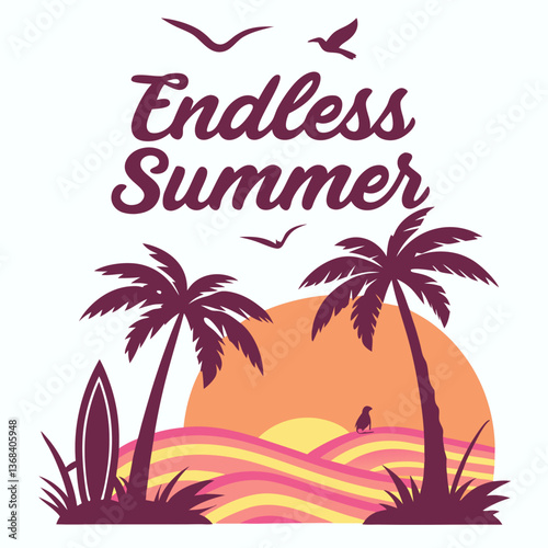 Naklejka premium Endless Summer: Tropical Sunset Beach Scene with Palm Trees and Surfboard