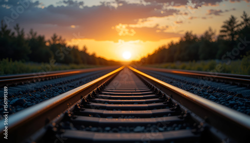 Fototapeta premium Endless Train Tracks Towards a Fiery Sunset Horizon