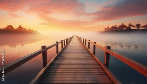 Fototapeta premium Endless Wooden Bridge into a Dreamy Misty Sunset
