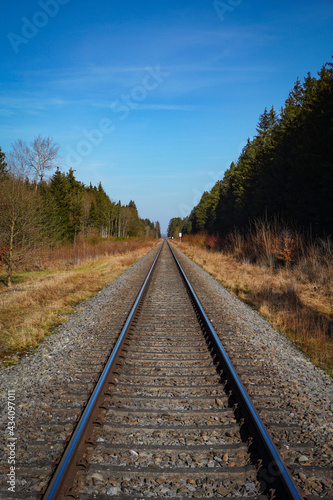 Fototapeta premium Endlose Bahngleise in den Wald