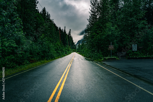 Naklejka premium Endlose Lange und Nasse Straße in Natur am Abend mit bewölktem Himmel