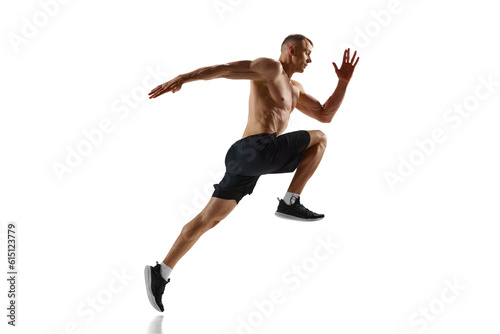 Fototapeta premium Endurance. Dynamic image of professional sportsman, shirtless muscular man in motion, running, training against white studio background
