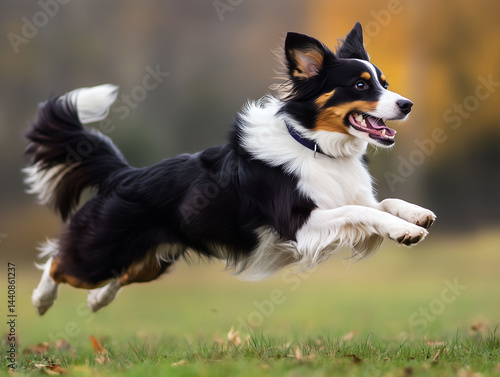 © Md. Din islam, Fototapeta premium Energetic Border Collie in Mid-Leap, Jumping Dog in Autumn Field