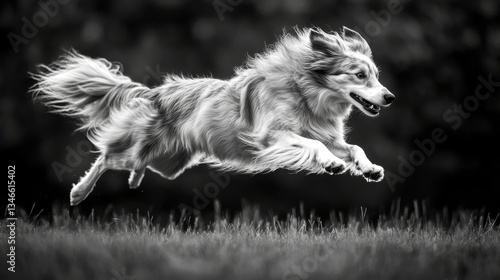 © Daphne, Fototapeta premium Energetic border collie leaping over grass in black and white action shot