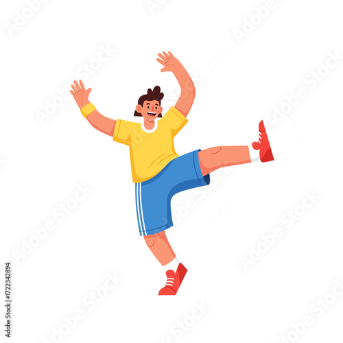 © RKHM, Fototapeta premium Energetic cartoon character playfully posing in a dynamic sports-inspired dance move against white