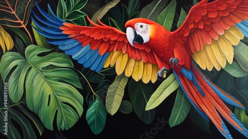 Fototapeta premium Energetic composition featuring parrots with vivid wings, flying in harmony through a lush tropical landscape filled with vibrant greenery