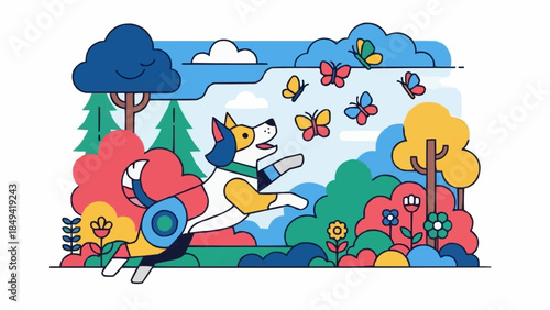 Naklejka premium Energetic dog chasing butterflies in a vibrant park setting.