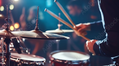 © hsantima, Naklejka premium Energetic drummer performing at live concert.