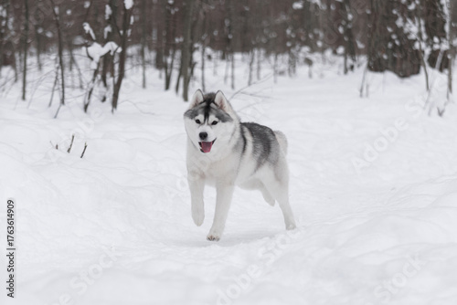 Naklejka premium Energetic husky moving forward through deep snow, gray-white fur illuminated by winter light, forest trees blurred in background, motion sharp and natural.