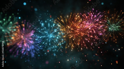 Fototapeta premium energetic loop of grand fireworks finale, rainbow-colored bursts in clean dark space, sparkling particles, festive abstract motion