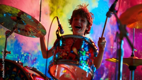 Obraz premium Energetic young drummer performing with enthusiasm against a colorful...
