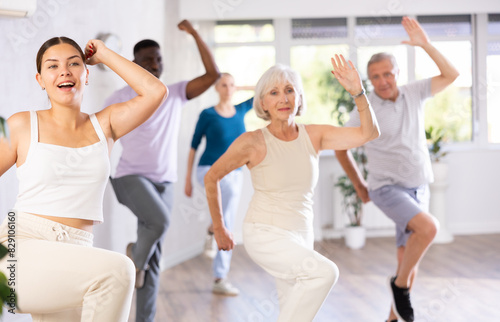 © JackF, Fototapeta premium Energetic young girl dance instructor conducting class for mixed age group of adults, practicing modern vigorous dance movements