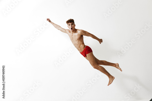 © SHOTPRIME STUDIO, Obraz premium Energetic young man jumping in mid-air with an expressive face, showcasing excitement and joy against a white background. Concept of freedom and vitality.
