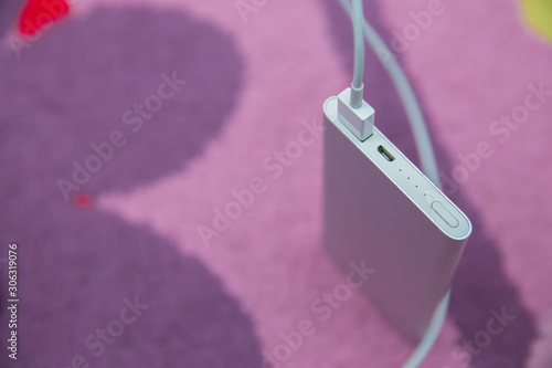 © Adil, Fototapeta premium Energy bank . Smartphone Charging with silver Power Bank Through Spiral USB Cable . Smartphone charging with power bank on pink carpet .
