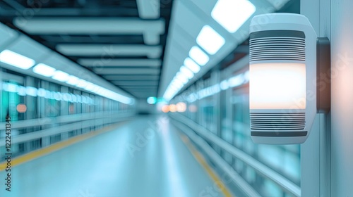 Naklejka premium Energy efficiency idea. A modern corridor illuminated by stylish wall lights, creating a sleek atmosphere.