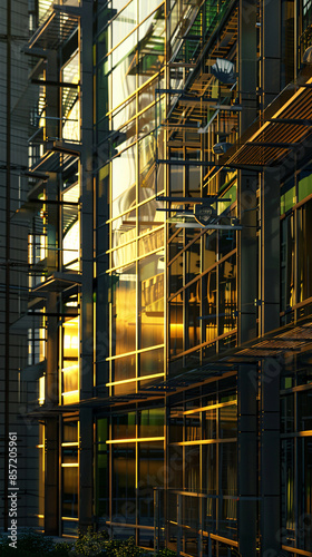 Obraz premium Energy-Efficient Gothic Revival: Abstract Art of a Sustainable Office Building with Solar Panels and Modern Design Elements