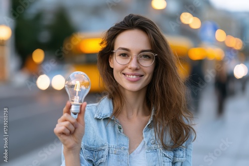 © VolumeThings, Obraz premium Energy saving idea Happy young woman promoting new LED technology