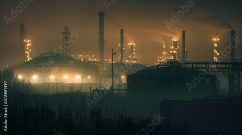 Fototapeta premium Energy Sector Scene Featuring Large Refinery Buildings, Emission Towers, And Foggy Illumination For Industrial-Themed Applications