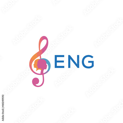 Fototapeta premium ENG “Creative music logo with human silhouettes and treble clef in gradient colors, ENG Later Logo, modern artistic design isolated on white background”