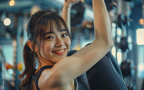 Obraz premium Engaged in weight training, an Asian girl works on building muscle strength...