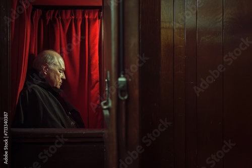 Naklejka premium Engaged Priest Hearing A Person's Confession In A Confessional Booth