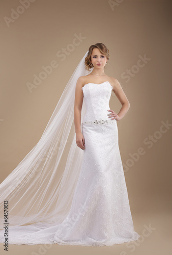 © gromovataya, Fototapeta premium Engagement. Bride wearing Sleeveless Ivory Dress and Veil